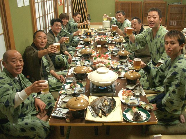 温泉で温まった後は、いよいよ宴会で〜す!今年一年お疲れ様でした!それでは乾杯〜! ここの料理は量と鮮度が違いますね〜舟盛りには皆さんびっくり!!伊勢エビ、アワビ、お刺身、すんごく美味しかった〜! |